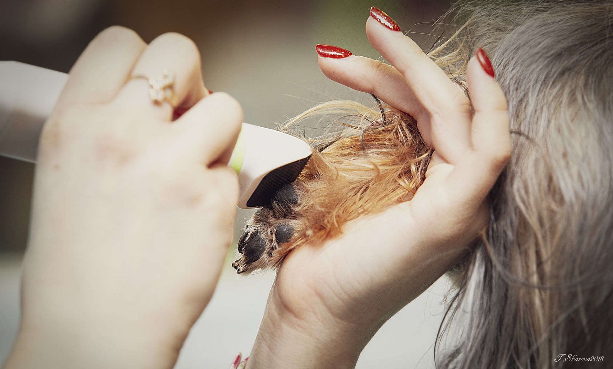4. Нанесение спрея-антистатика, прочёсывание отмершего подшерстка с одновременным просушиванием каждой пряди шерсти питомца.